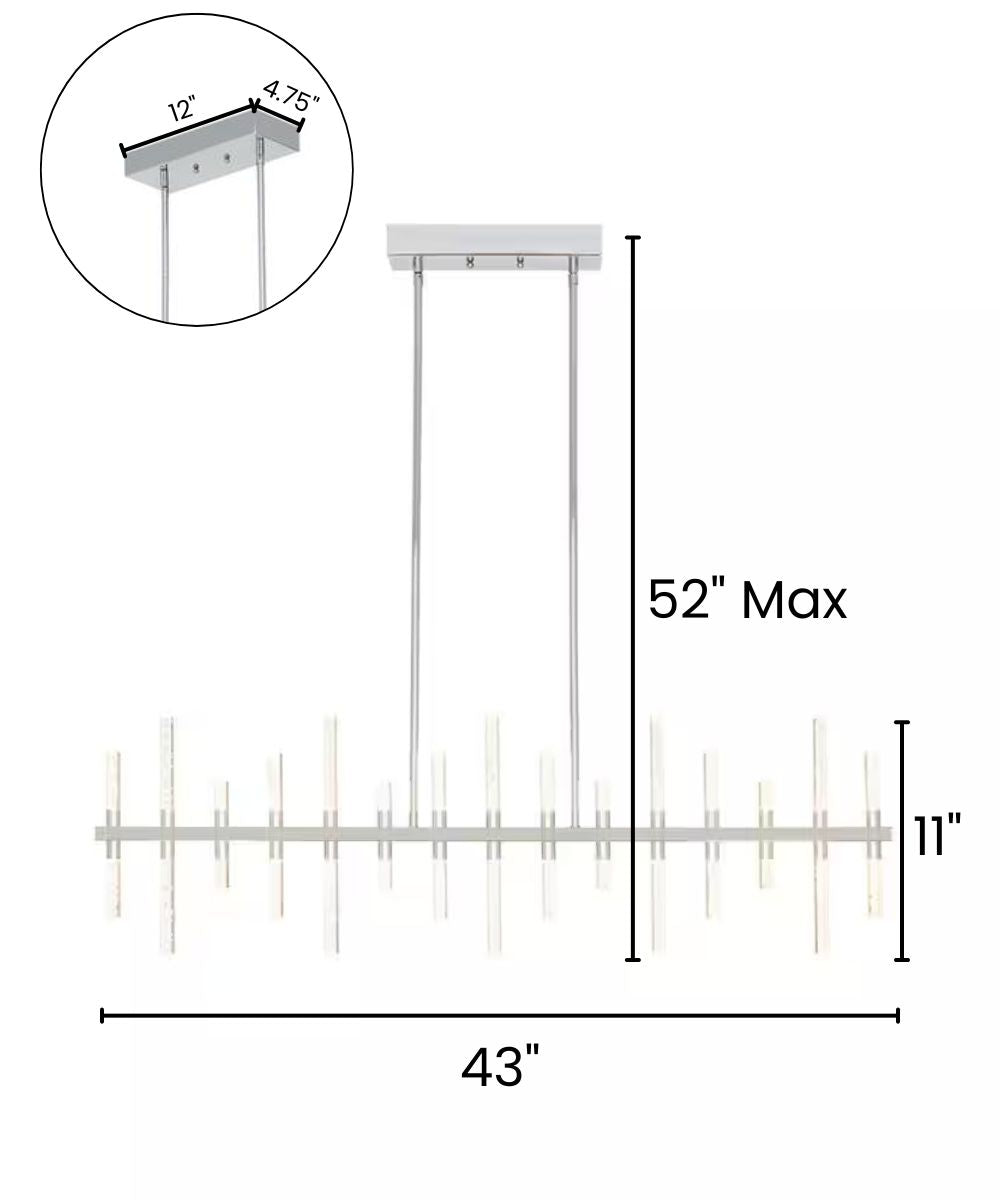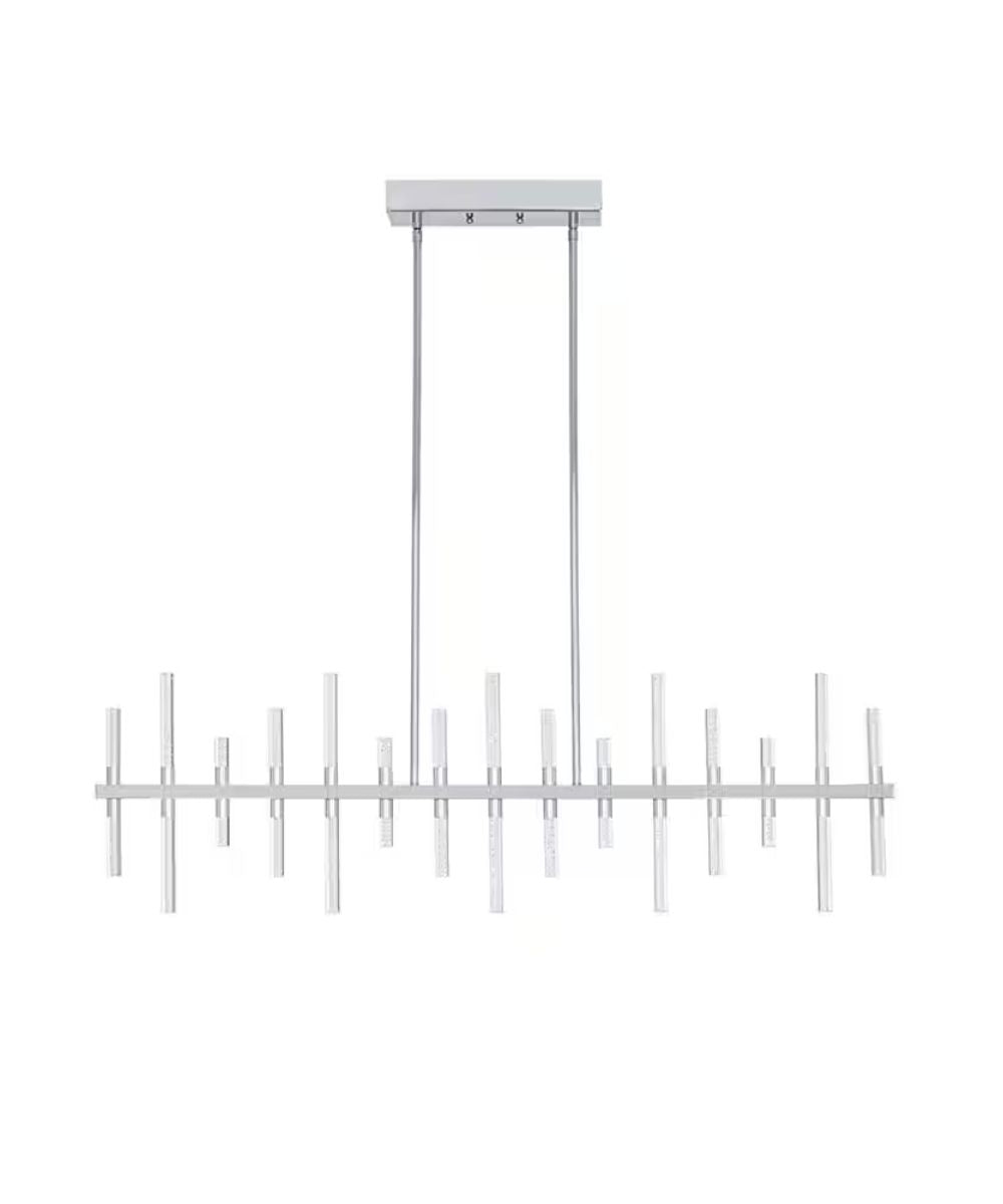The Alsy 43"W Modern Chic LED Chrome Finish Island Pendant Dining Light Fixture is a stunning blend of modern design and chic sophistication. This elongated chandelier features a sleek, linear form that is both contemporary and elegant. The fixture is adorned with 30 crystal clear acrylic cylinders, each encased in bubbles, creating a captivating visual effect. The staggered heights of these cylinders resemble a modern cityscape, adding an artistic touch to your space.