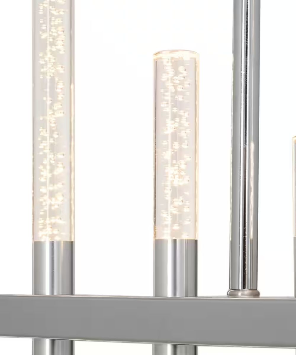 This pendant light works beautifully with modern, contemporary, and minimalist room themes. Its clean lines and polished chrome finish complement a variety of decor styles, from urban lofts to sleek, modern homes. The bubble-encased acrylic cylinders add a touch of glam, making it a versatile piece that can elevate the look of any room.