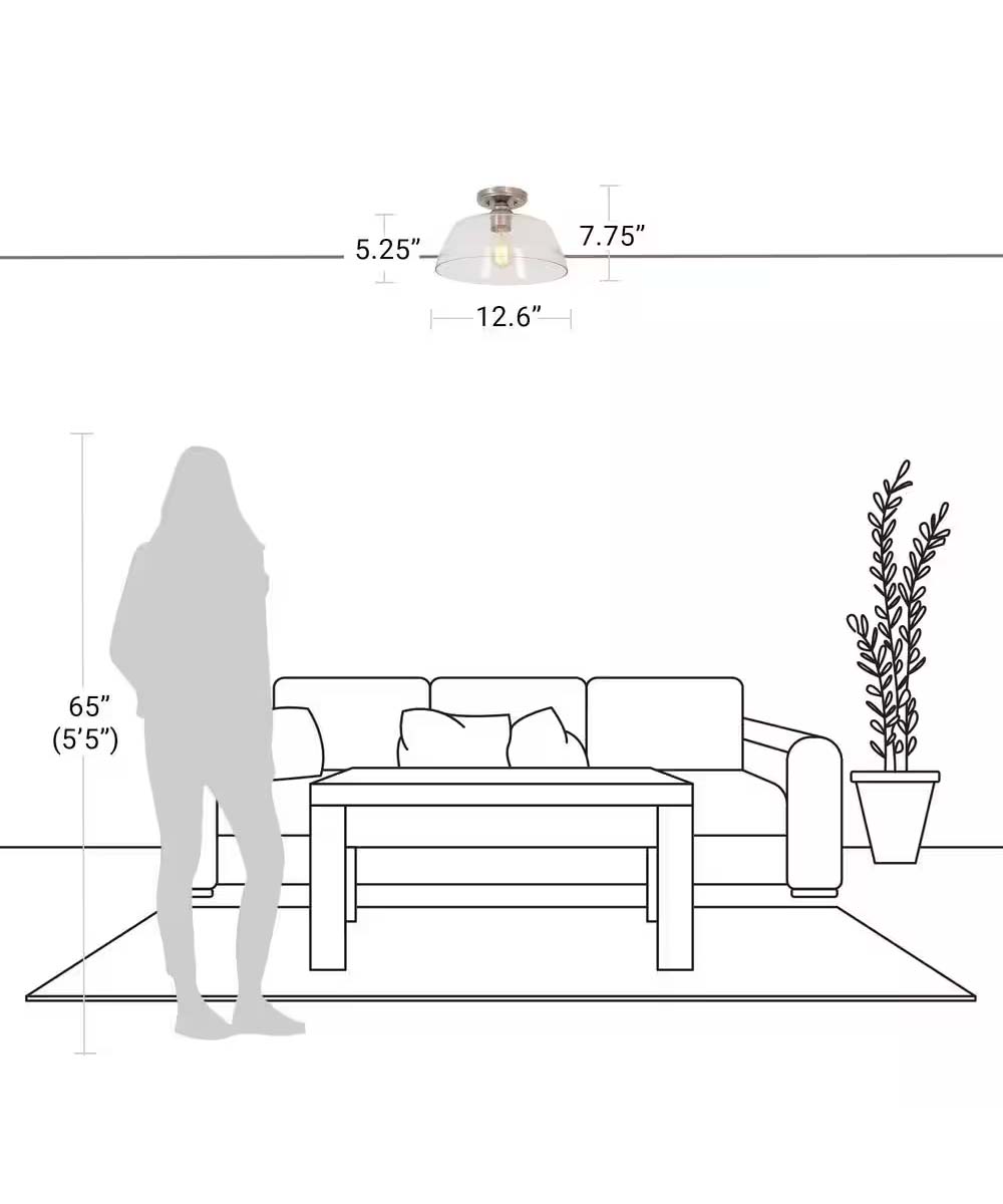 Measuring 12.5 inches in diameter and 7.75 inches in height, this semi-flush mount light fixture is designed to make a statement without overwhelming your space. The round glass bell-shaped shade, with a width of 12.5 inches and a height of 5.25 inches, provides ample lighting and adds a touch of elegance. The ceiling canopy, measuring 5 inches in width and 0.4 inches in height, features a beautifully beveled silhouette that matches the overall design of the fixture.