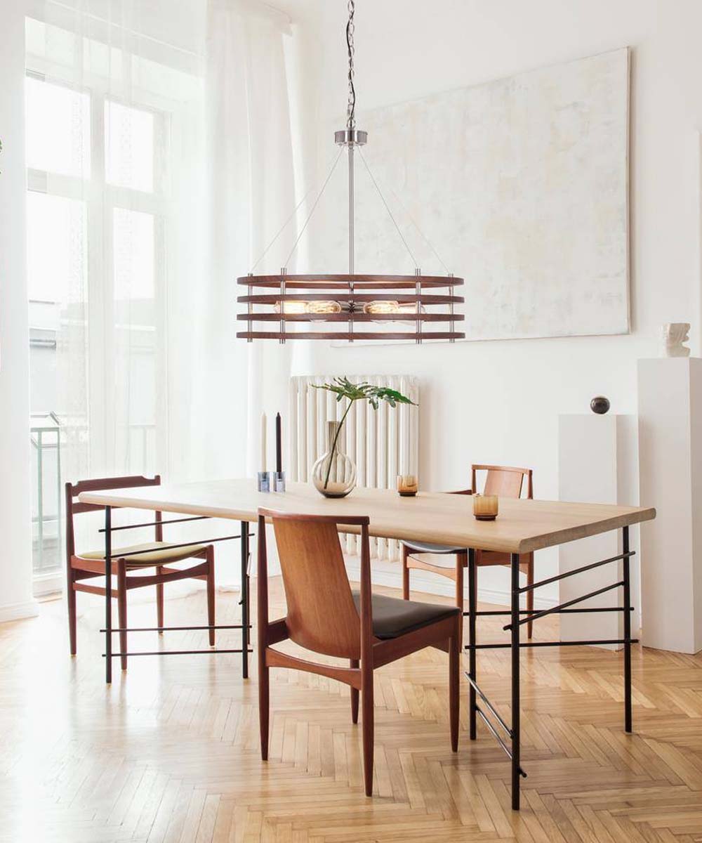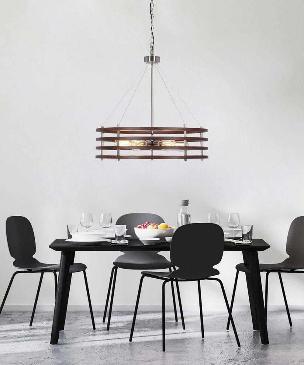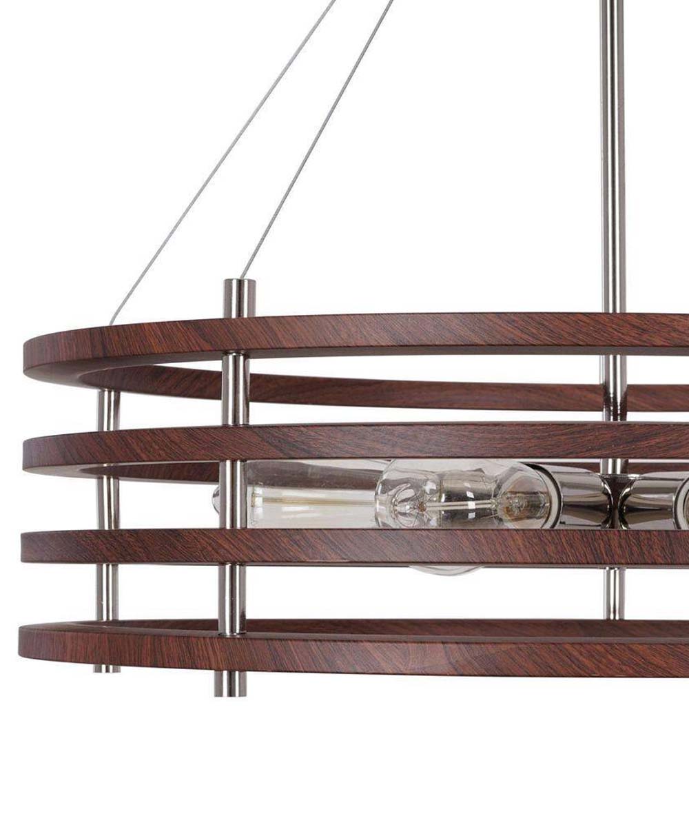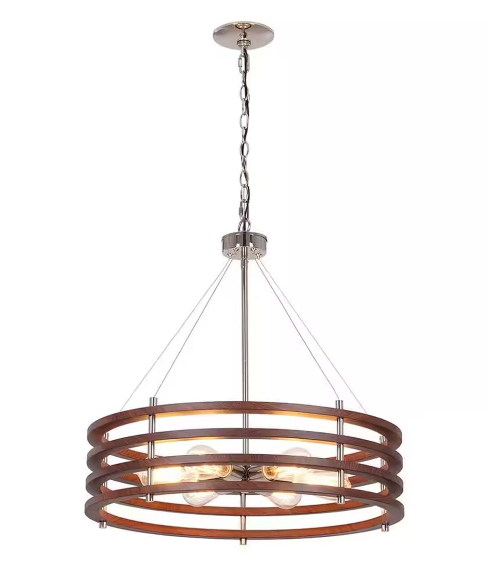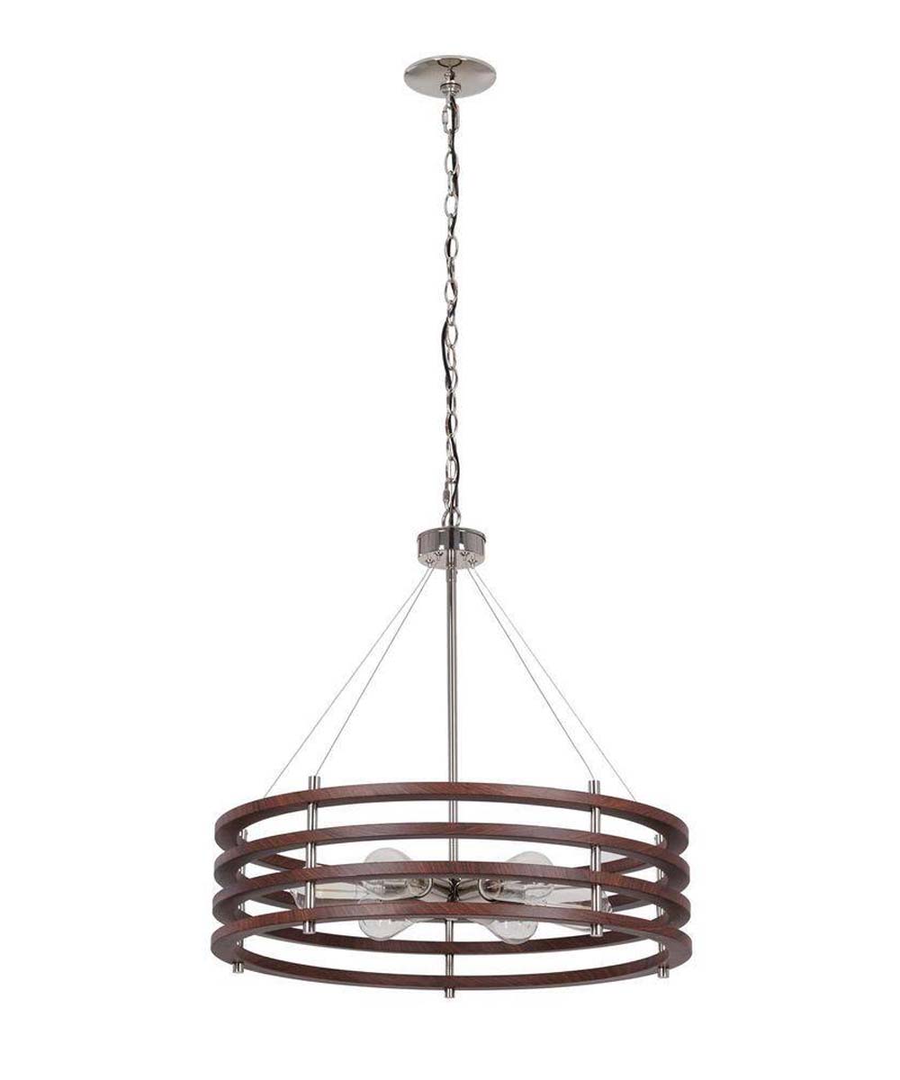 This pendant light is crafted with meticulous attention to detail. The four-tiered brown mahogany wood trim shade is complemented by shiny polished nickel metal hardware, embodying the perfect blend of traditional warmth and modern sophistication. The round shade measures 24 inches in width and 7 inches in height, featuring an open top and bottom with spaces between tiers that allow light to shine brightly and evenly throughout the room.