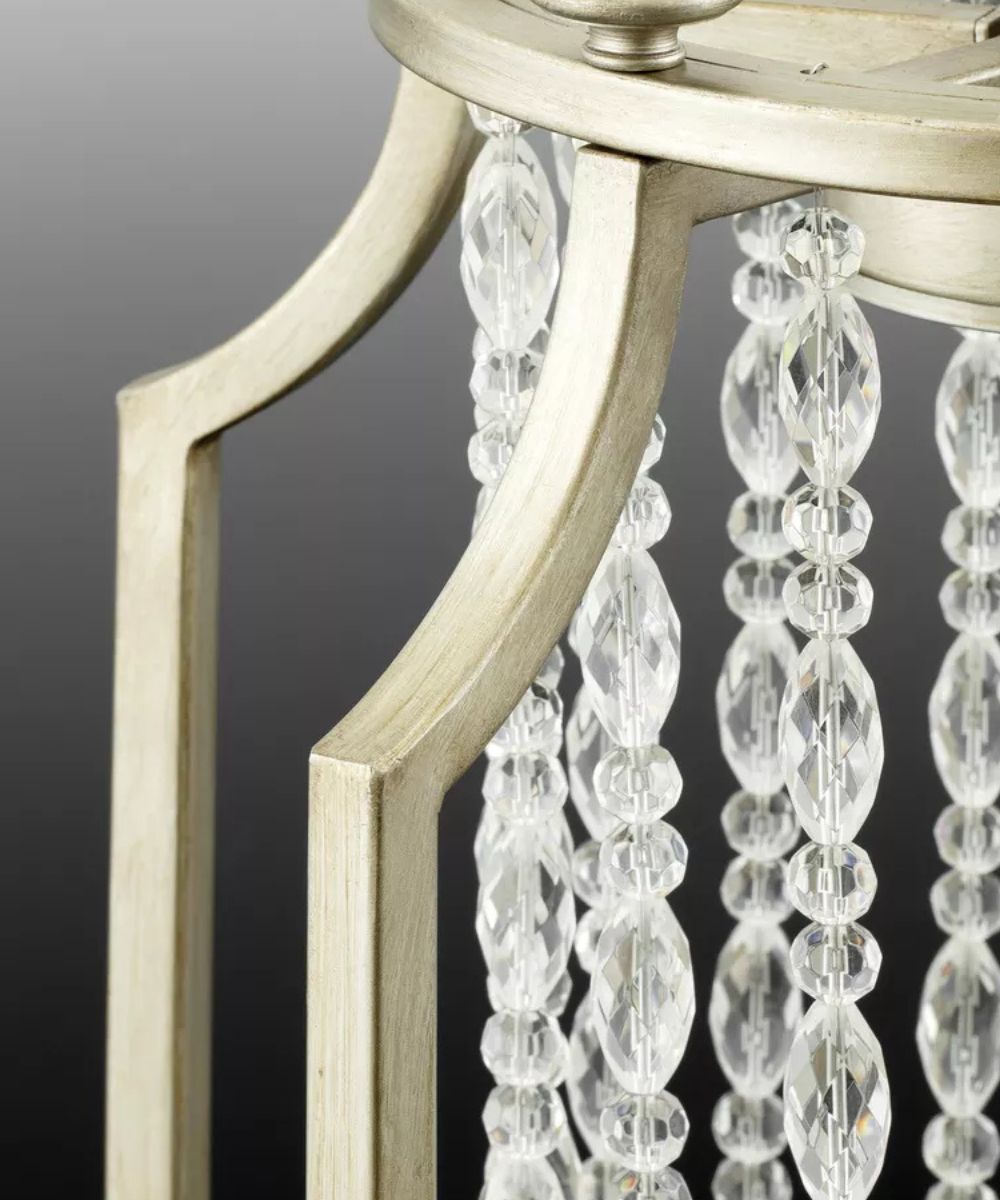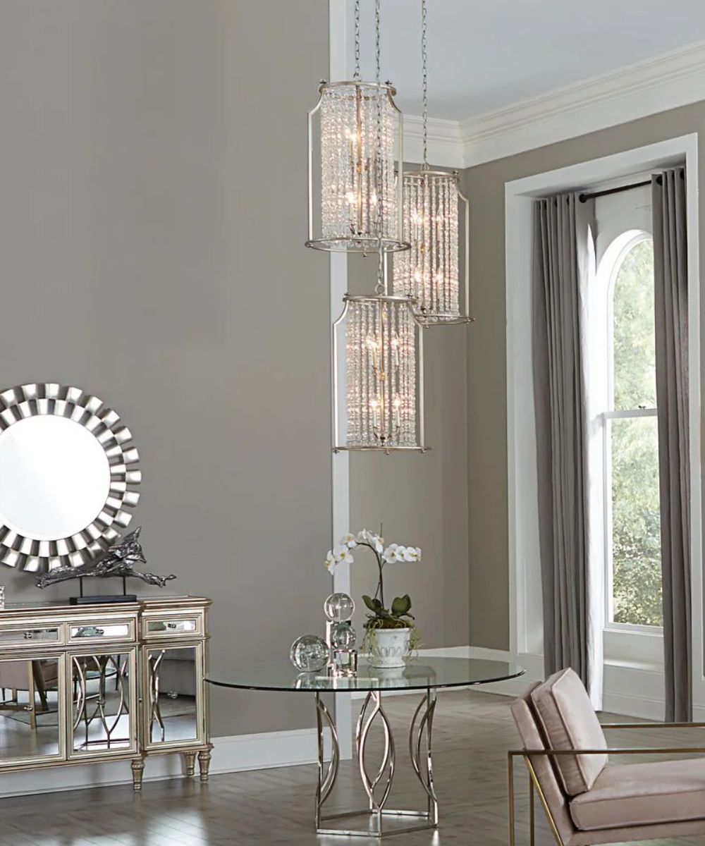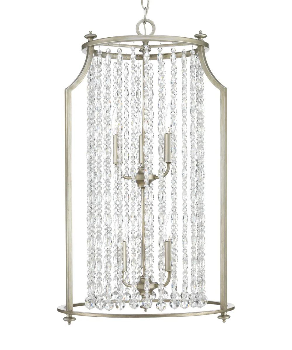 The Desiree foyer chandelier features luxury materials and details reminiscent of Hollywood's Regency "Golden Era." A Silver Ridge finish and clear crystal strands cascade in a waterfall effect to convey the glitz and glamour from an iconic time that is making a modern comeback. Perfect foyer chandelier to create a dramatic entry space. Progress Lighting offers high-quality lighting that brings aesthetic appeal, stellar performance, easy installation and value to the finest American homes. Progress light fixtures showcase artistic influence, on-trend elements and thoughtful details that combine to create affordable luxury for the home. Progress Lighting products are designed for exceptional quality, reliability, and functionality.