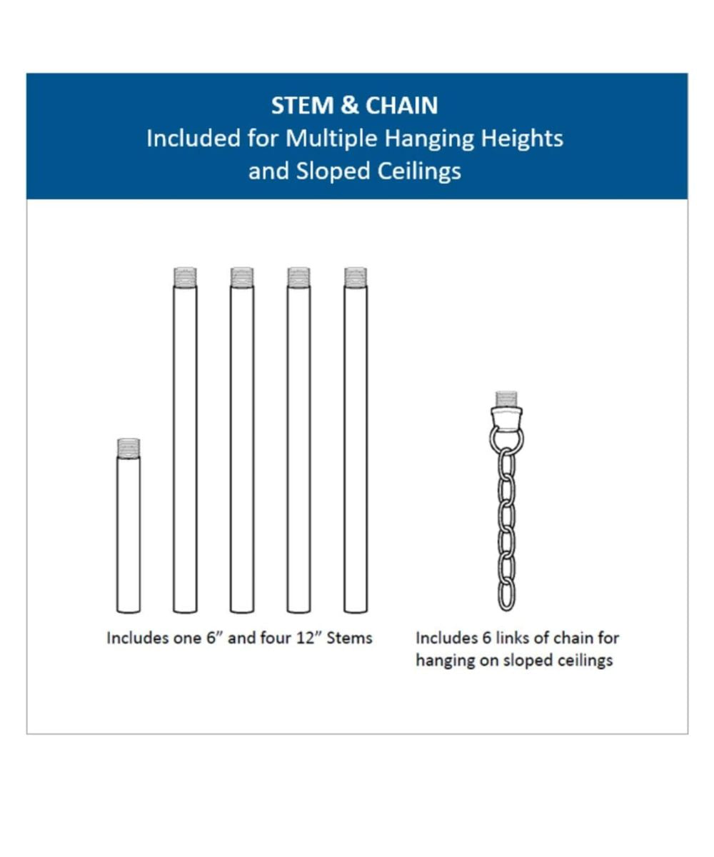 - EASY INSTALLATION - Includes all mounting hardware and installation instructions for quick and easy installation. Ceiling stem hung with 6 links of chain mounted. Six links of 9 gauge chain supplied. CULus Dry Location Listed. 1-Year Limited Warranty. Weight:7 lbs. Title 24 Compliant.