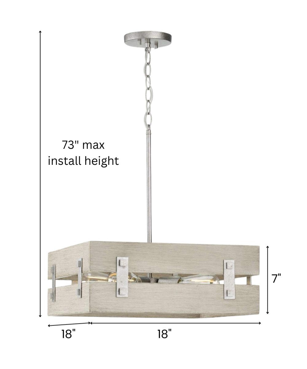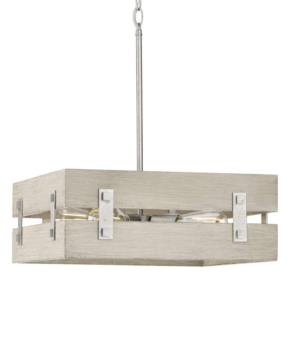 - FINISH - Galvanized barn-inspired metal details complete this must-have farmhouse design. Country character is the cornerstone of this light fixture that features a crate-like frame composed of bleached oak. Create an extension of your personality and lifestyle with the rustic charm of this pendant. Ideal for any foyer, kitchen, or dining room. Perfect for urban industrial, rustic, farmhouse, or coastal settings.