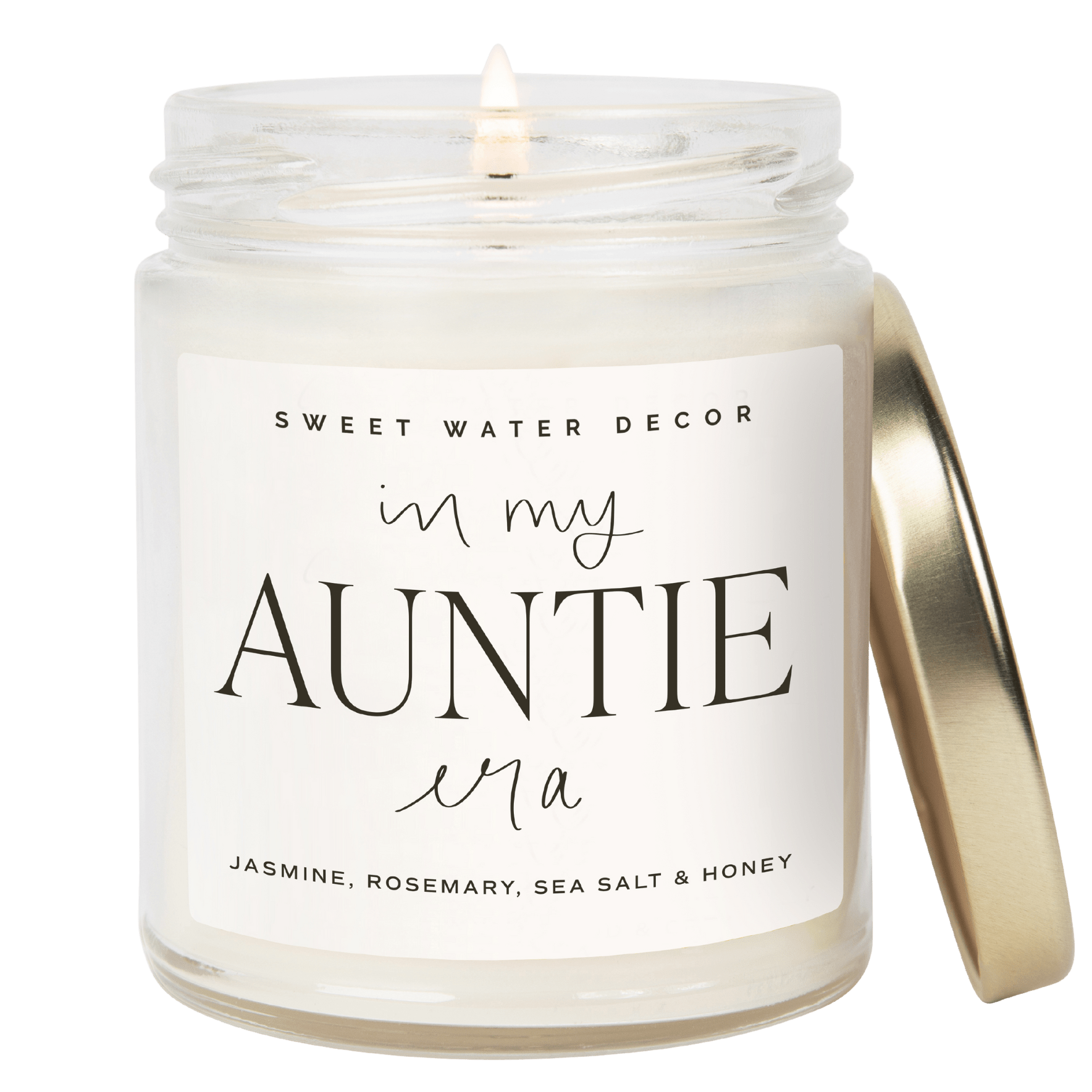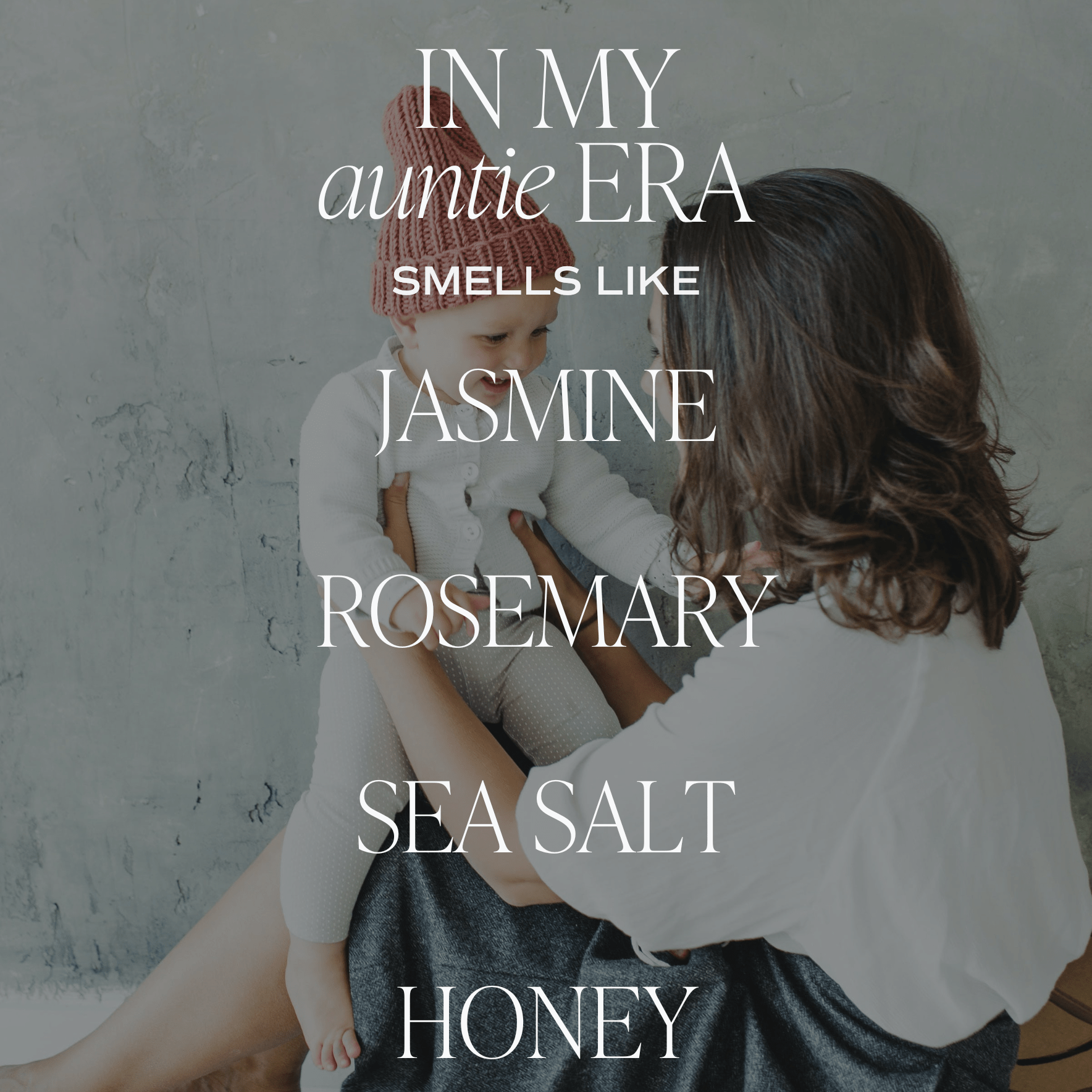 Introducing our Auntie Era candle – because every baby's aunt deserves her own soundtrack. Infused with our Wildflowers & Salt fragrance, this candle has scent notes of jasmine, rosemary, sea salt, and honey, creating a cozy haven she'll adore. Get ready for the sweetest vibes and make a baby announcement as unforgettable as a pop song chorus.