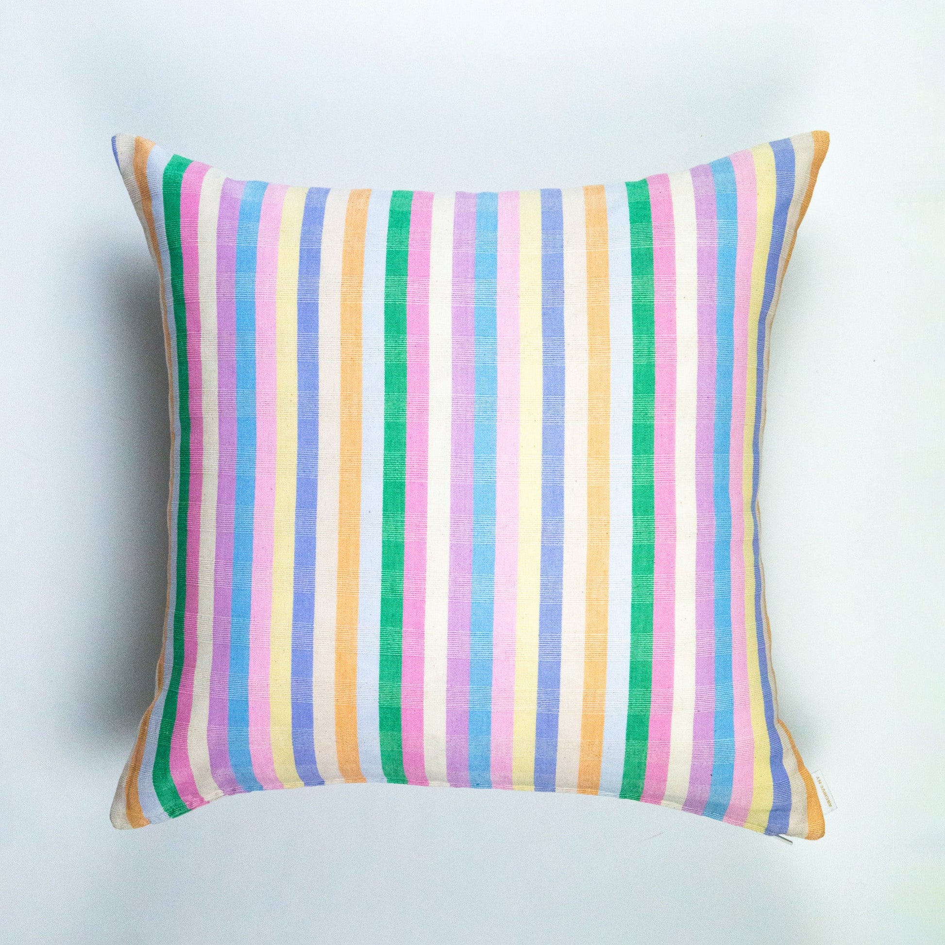 The Maxine pastel rainbow striped pillow is the perfect rainbow accent to add color and texture to any sofa, bedroom or accent chair. Stripes of light pink, kelly green, periwinkle, peach, cream, hyacinth, light yellow, sky blue and lilac are woven together to create this brilliantly colorful piece. Ethically handwoven by artisans in Xela, Guatemala.