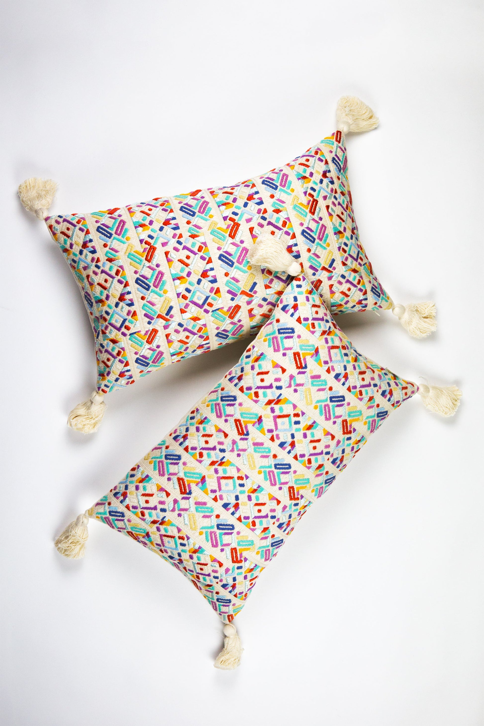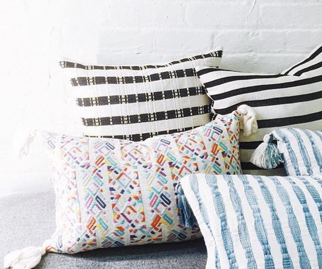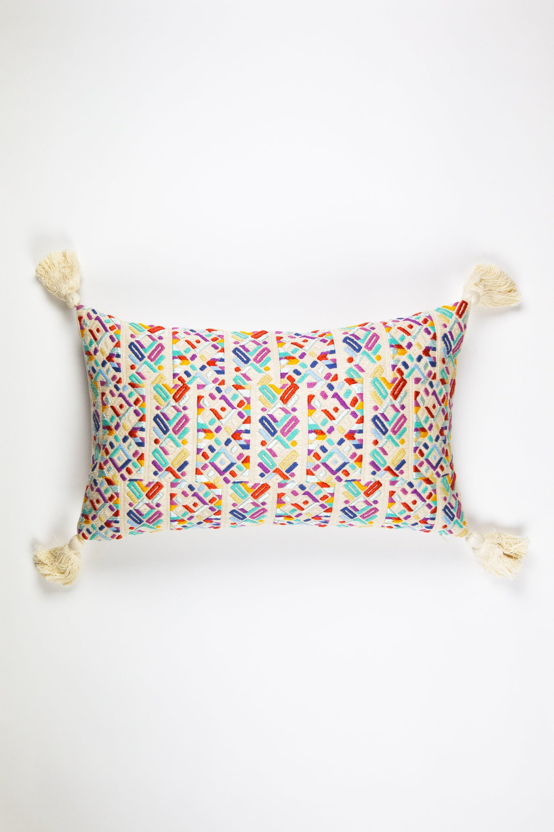 This textile was woven by an artisan from the village of Nahuala, Guatemala using a back-strap loom, a time honored method of weaving. The pattern represents one of Nahuala’s traditional geometric designs. This pillow was made in partnership with non-profit organization Maya Traditions.
