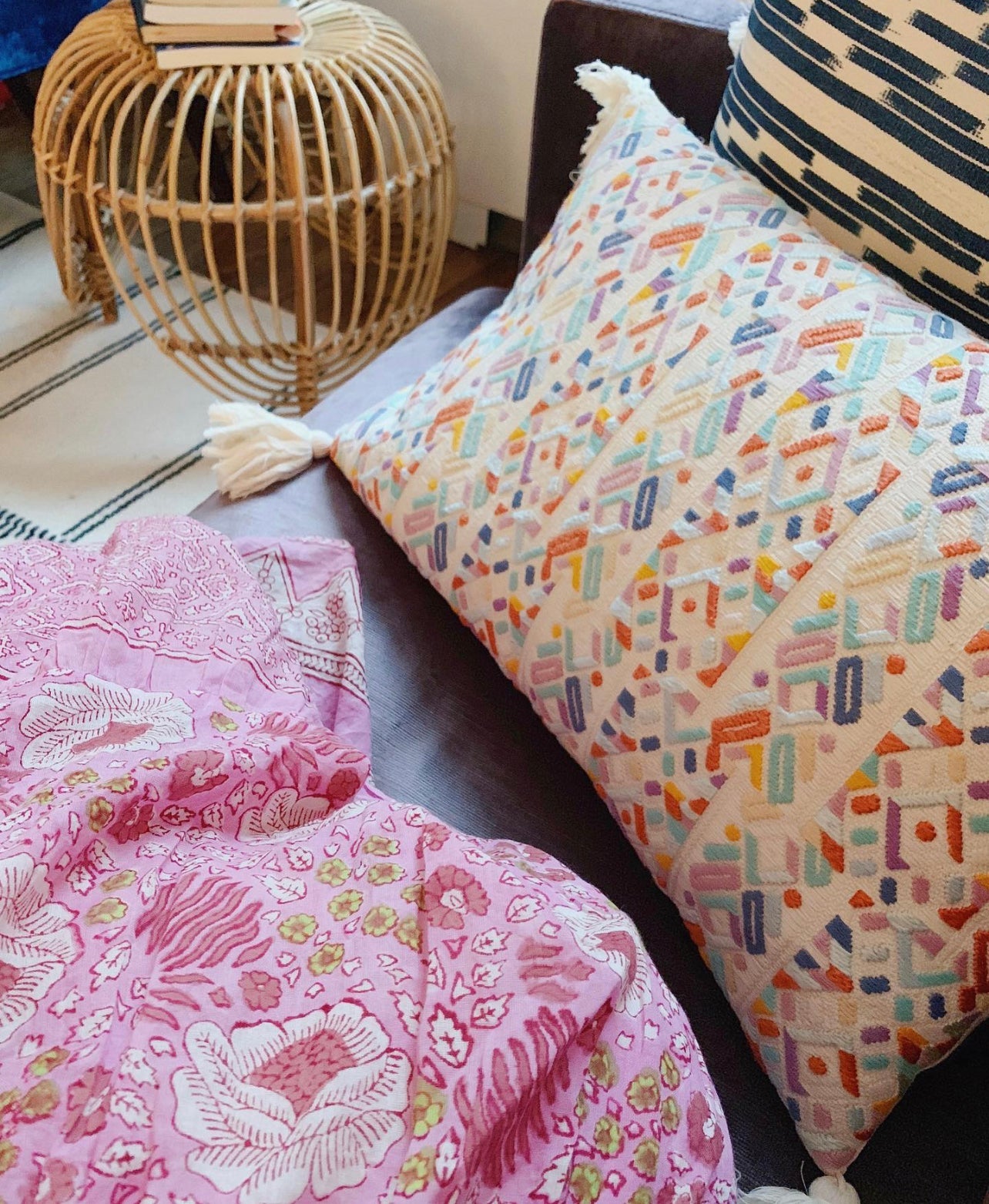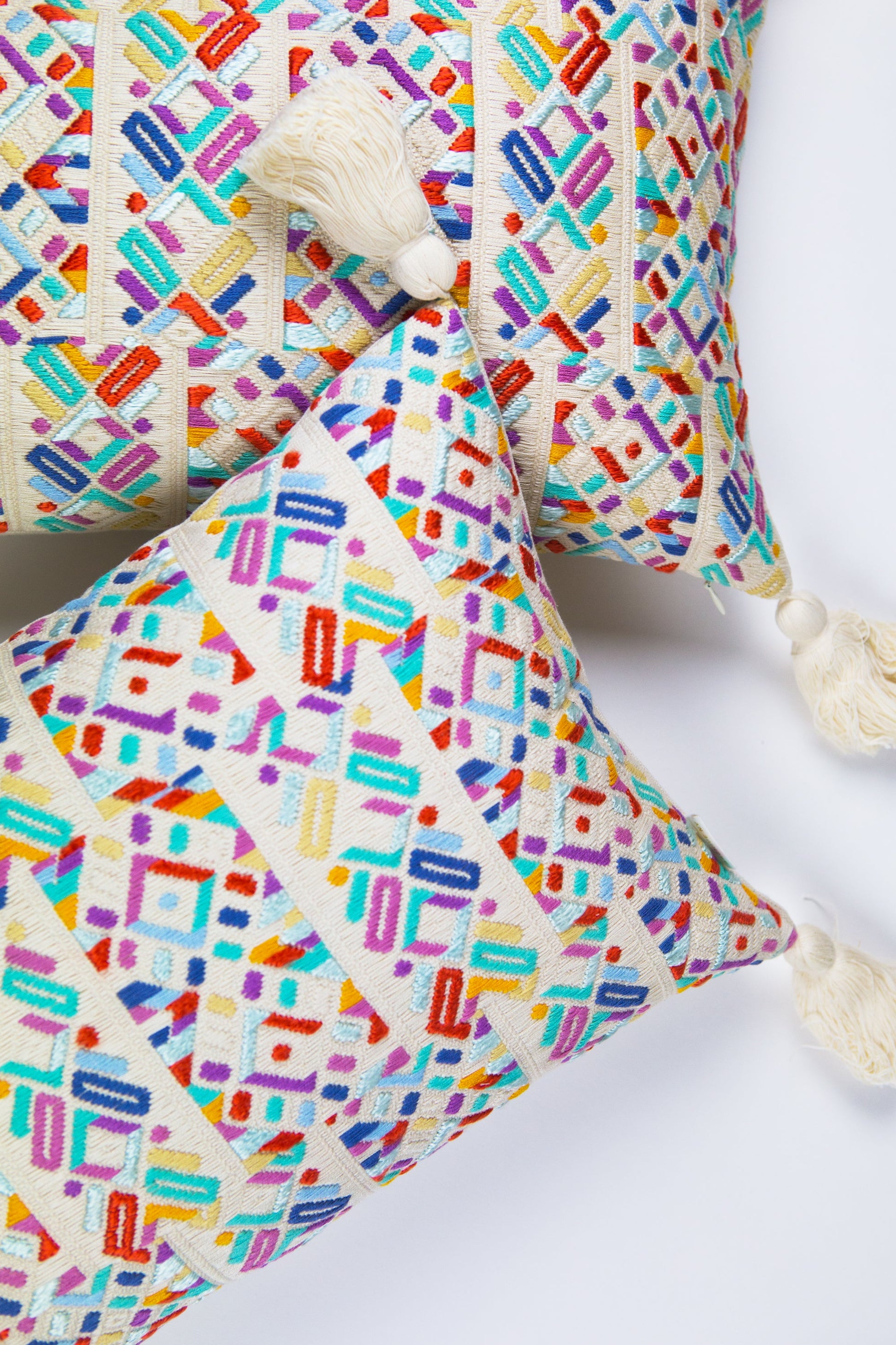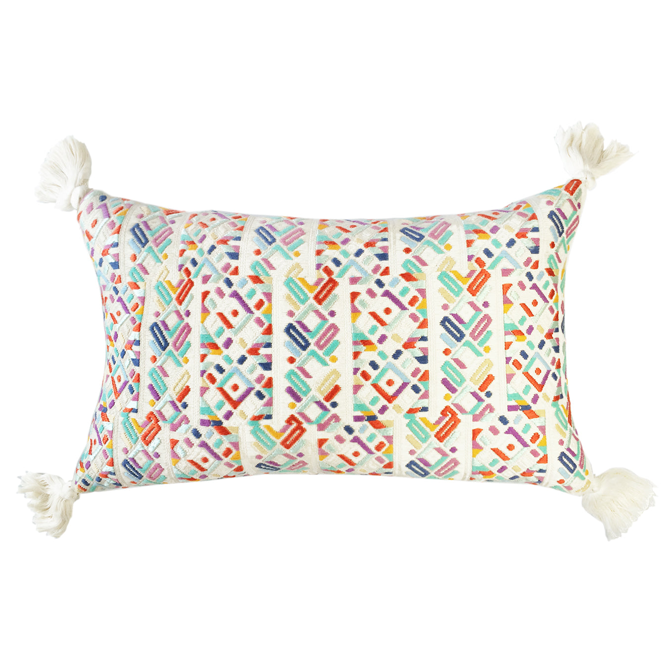 This textile was woven by an artisan from the village of Nahuala, Guatemala using a back-strap loom, a time honored method of weaving. The pattern represents one of Nahuala’s traditional geometric designs. This pillow was made in partnership with non-profit organization Maya Traditions.