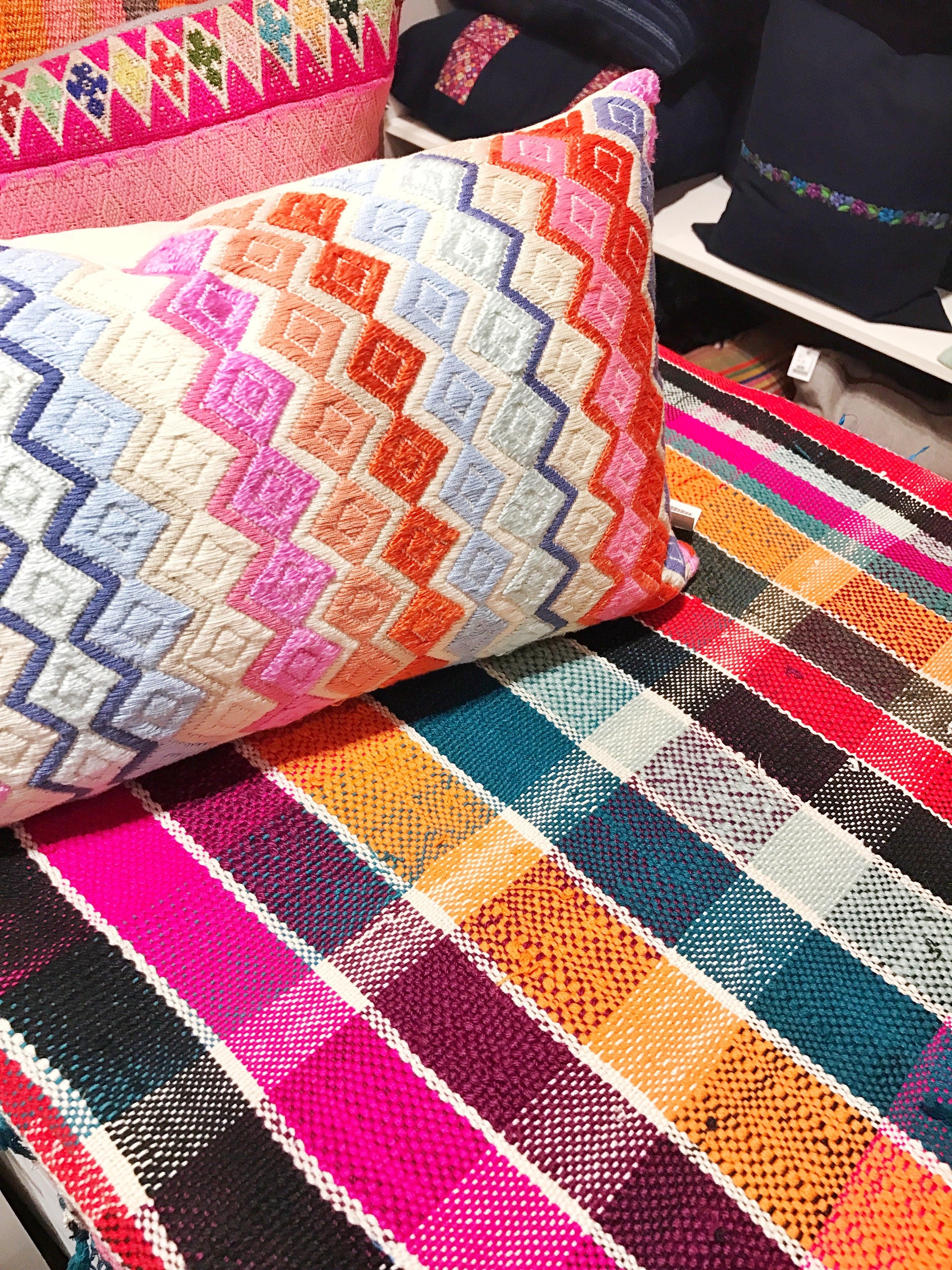 This textile was woven by an artisan from the village of Nahuala, Guatemala using a back-strap loom, a time honored method of weaving. The pattern represents the design of another village San Pedro Sacatepequez, but uses a the weaving technique from Nahuala. This pillow was made in partnership with a non-profit organization on Lake Atitlan, Guatemala.