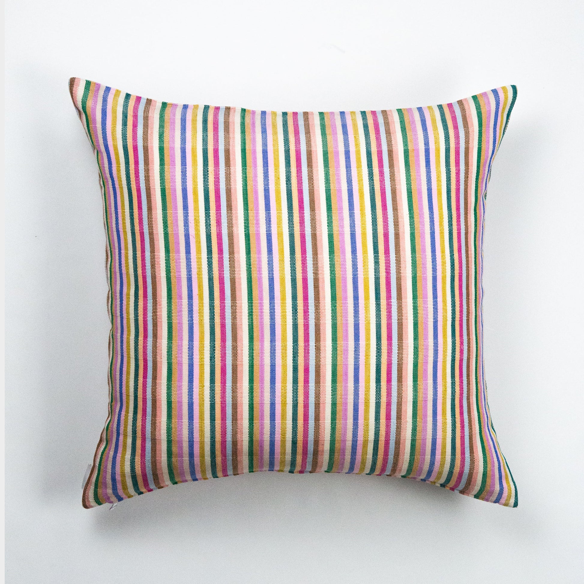 The Valentina multicolor striped pillow is the perfect rainbow accent to add color and texture to any sofa, bedroom or accent chair. Stripes of light pink, ochre, emerald, lilac, royal blue, umber and fuchsia are woven together to create this brilliantly colorful piece. Ethically handwoven by artisans in Xela, Guatemala.