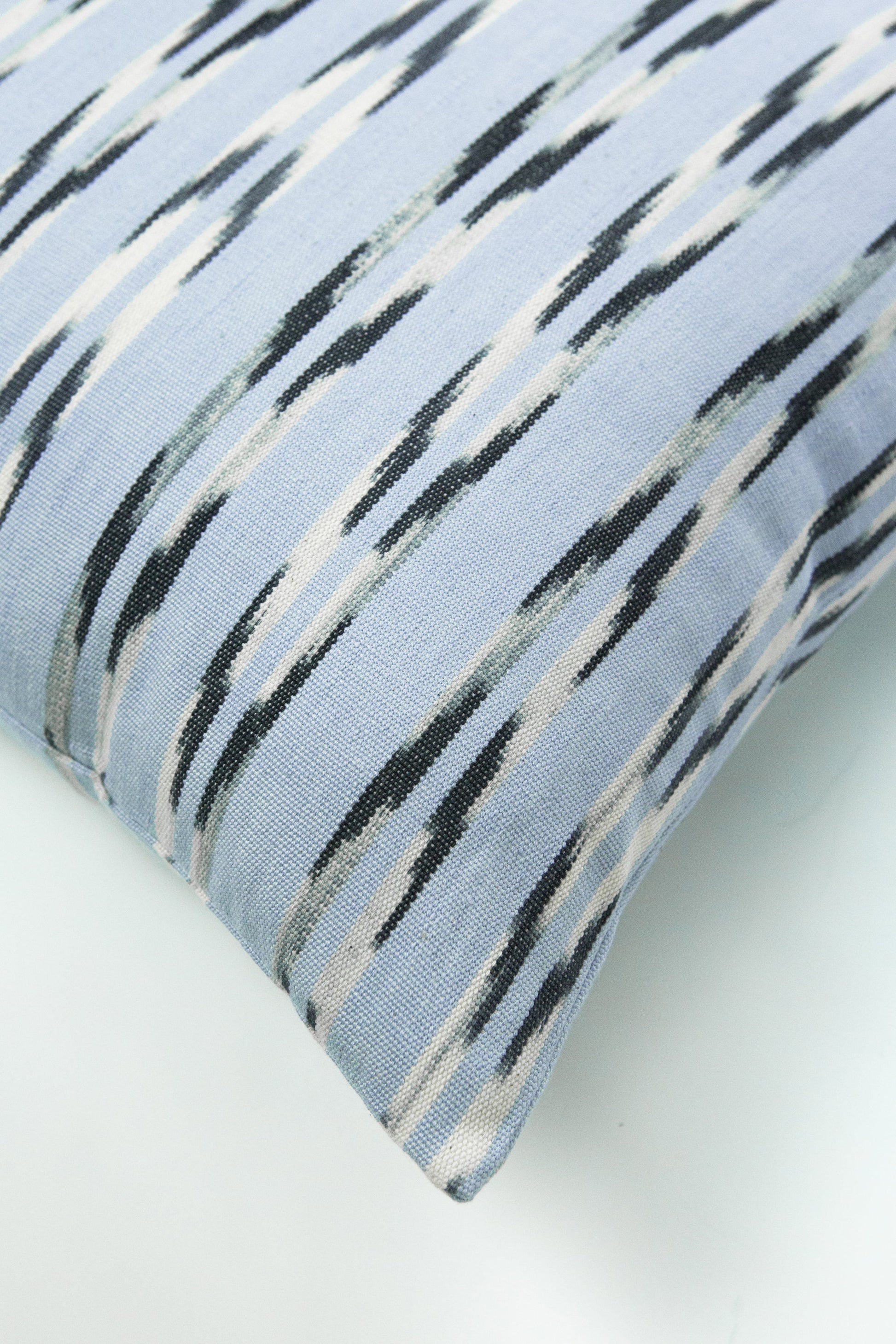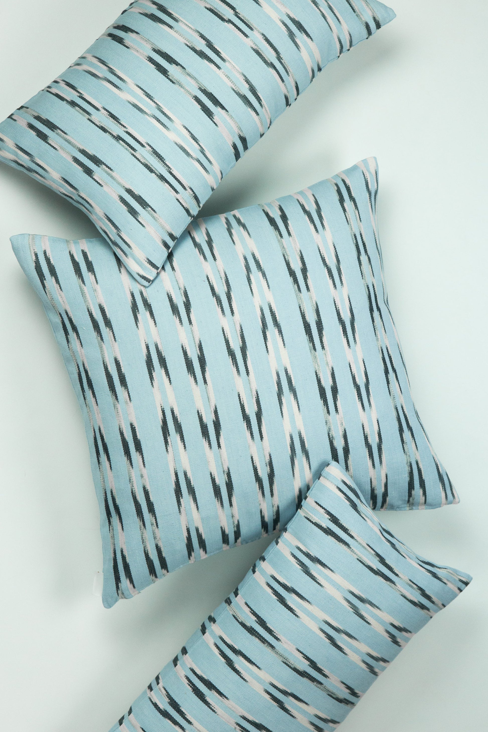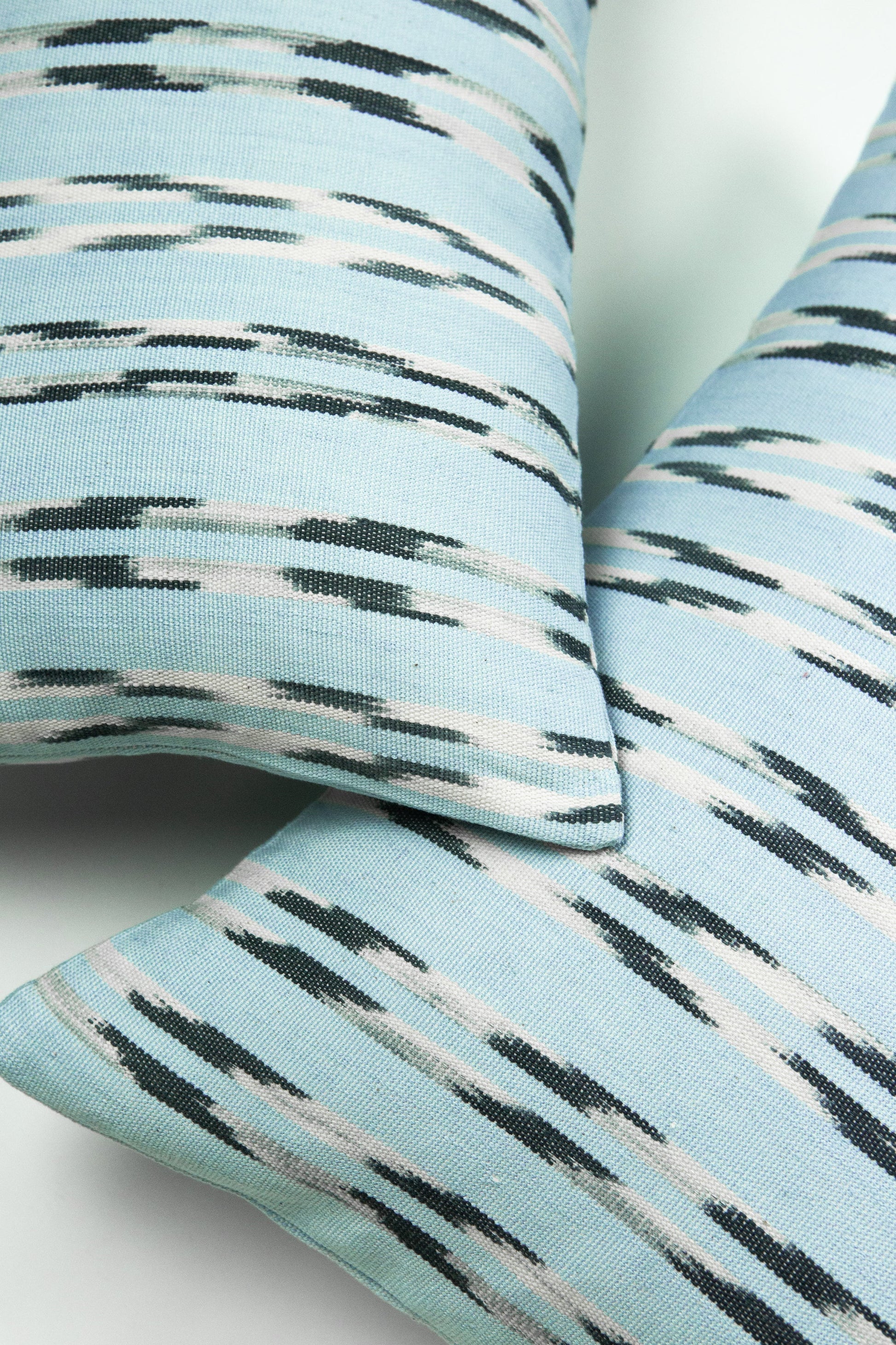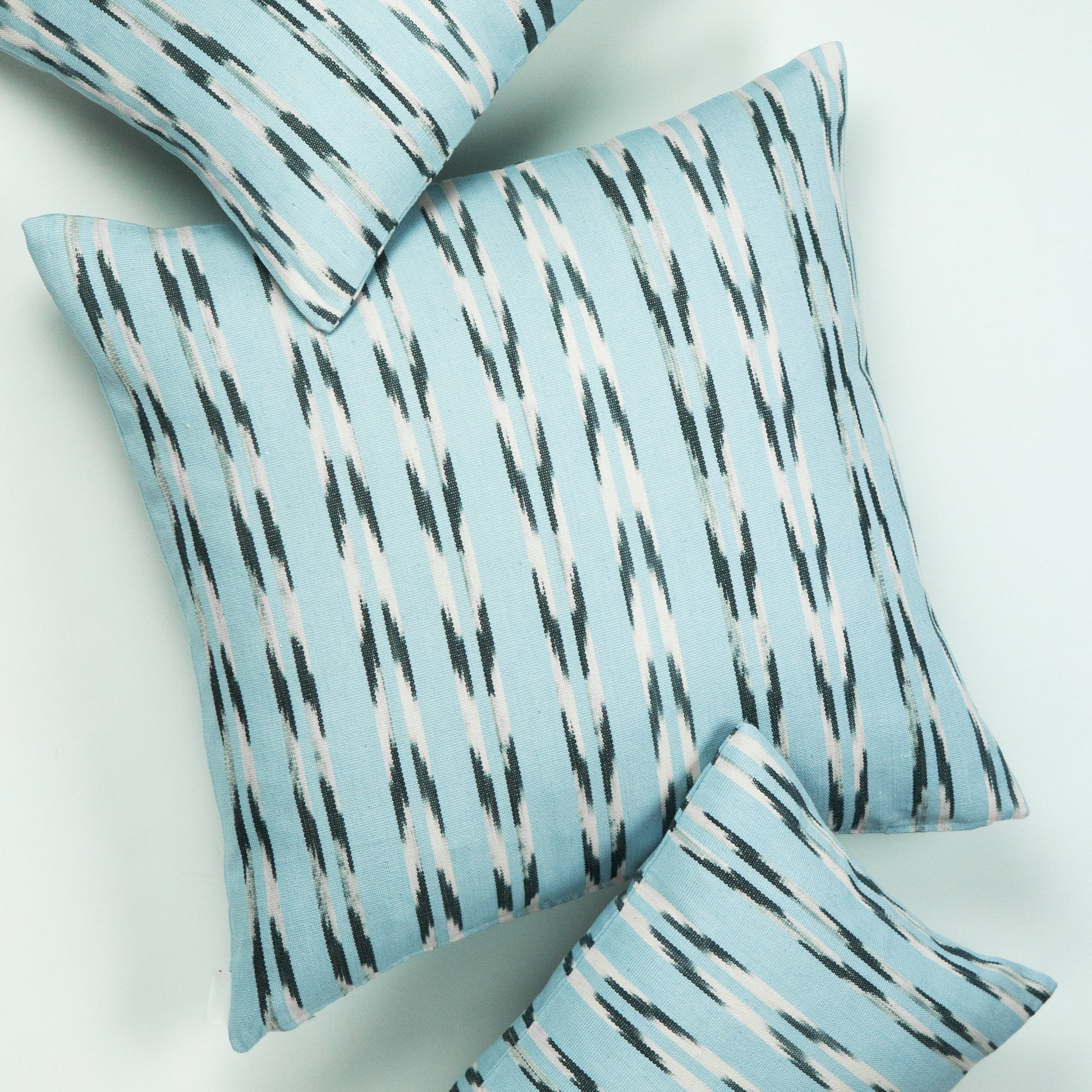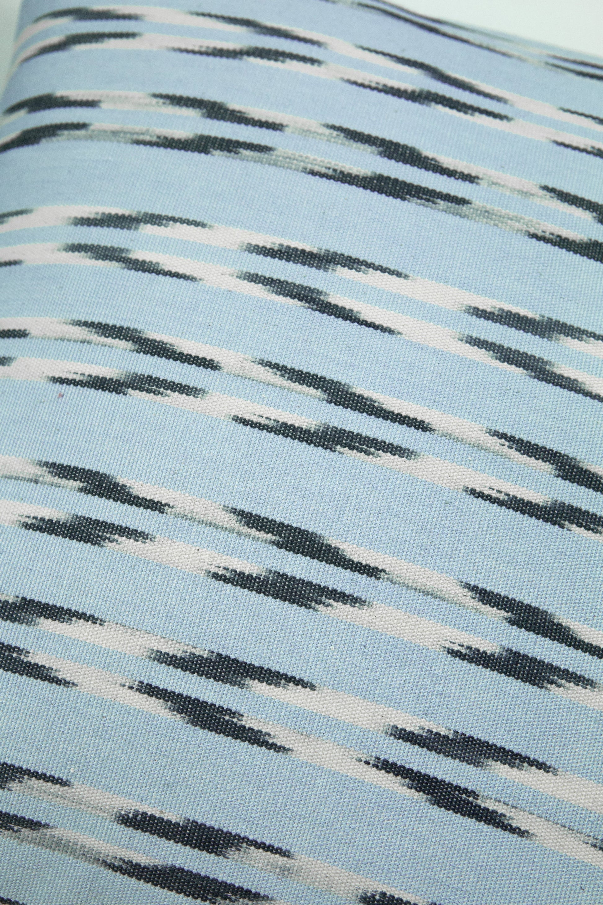 This light blue pillow was woven in Guatemala by artisans on traditional footlooms featuring an intricate Guatemalan tie dye technique jaspe that creates the stunning grey and white pattern running through this textile. Hand crafted and ethically made.