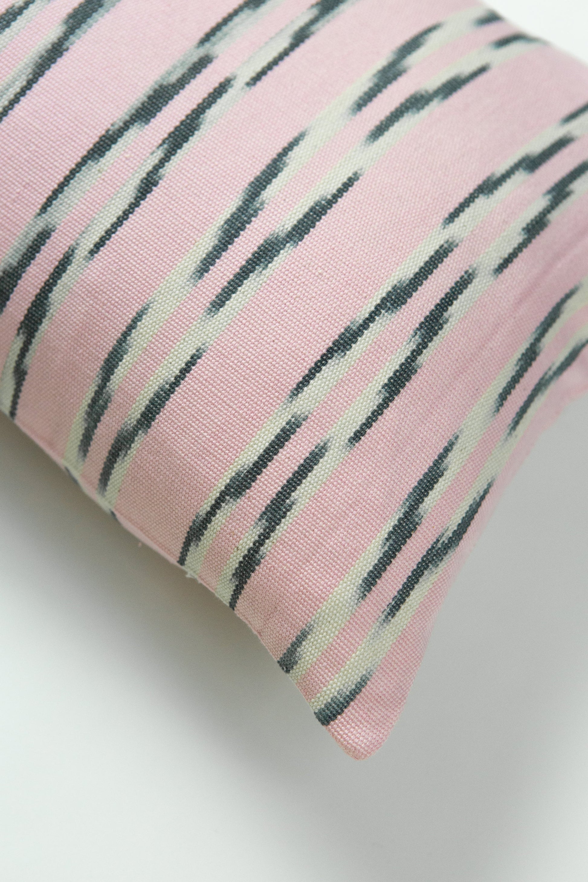 This light pink pillow was woven in Guatemala by artisans on traditional footlooms featuring an intricate Guatemalan tie dye technique jaspe that creates the stunning grey and white pattern running through this textile. Hand crafted and ethically made.